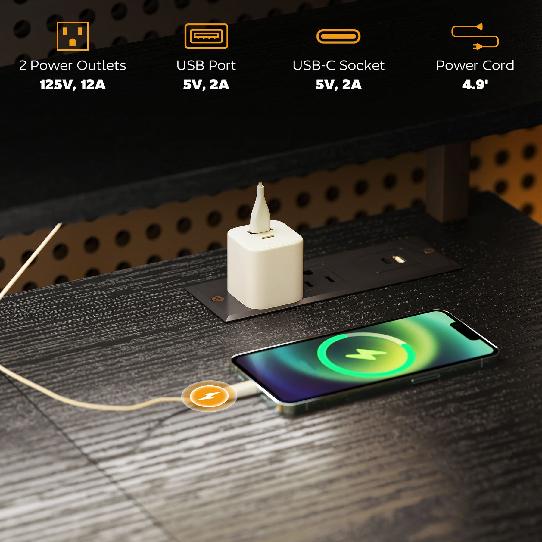 Computer Desk With Storage, 55 Reversible Computer Table With Power Outlets And LED Lights, Distressed Black